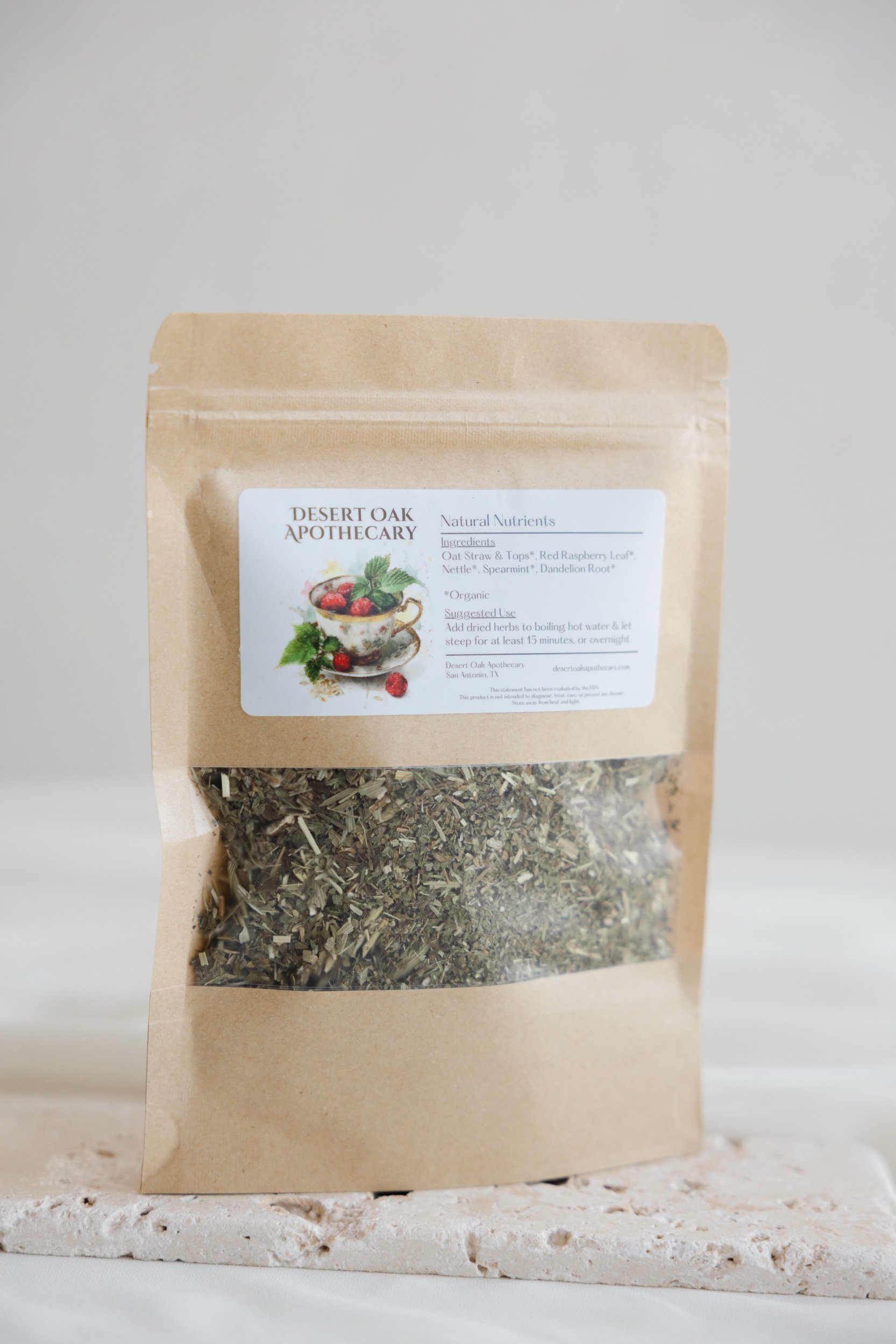 Ingredients: oat straw & tops*, red raspberry leaf*, nettle*, spearmint*, dandelion root*